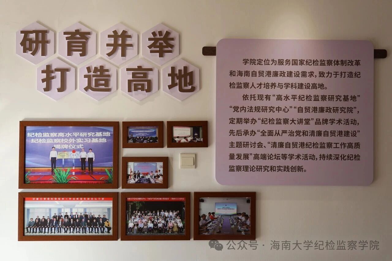 学院作为全国首批纪检监察学一级学科硕士学位授权点,一直以服务海南自贸港廉政建设为己任,长廊中展示的委校共建成果、学术研究相关内容,是学院推进“研育并举”工作的一个缩影。