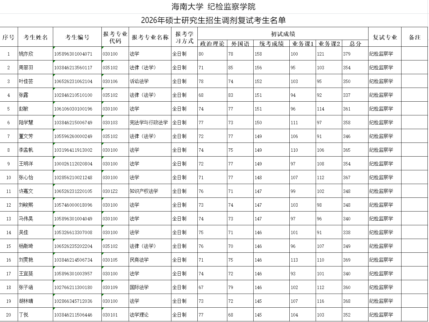 根据《海南大学纪检监察学院2026年纪检监察学(030800)硕士研究生调剂复试录取工作实施细则》,按调剂考生初试统考(外语、思想政治理论)成绩择优确定进入复试的考生名单;如初试统考成绩相同,则按外语成绩高低排名确定。